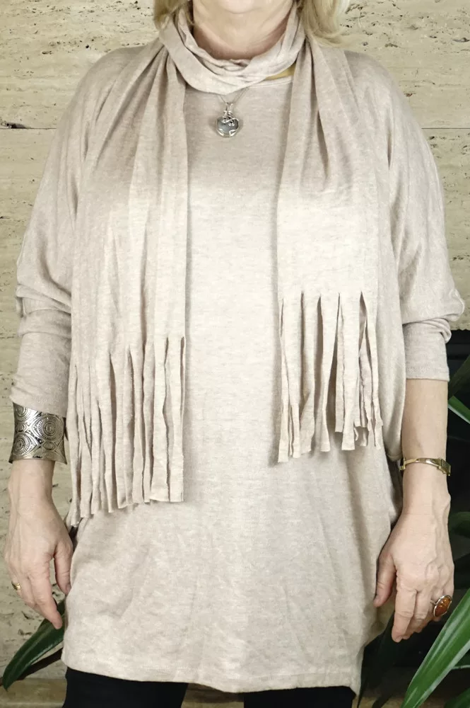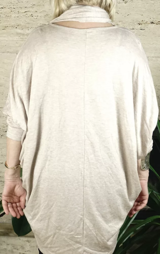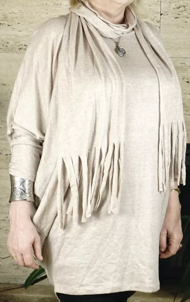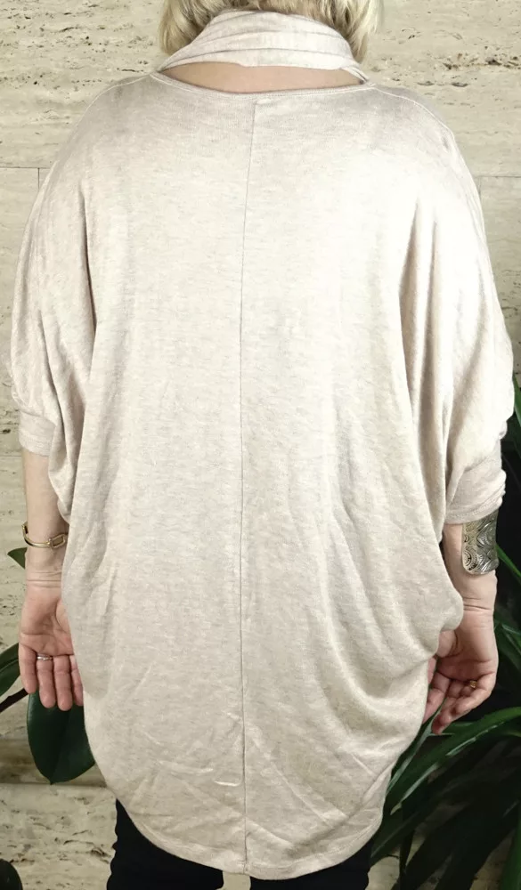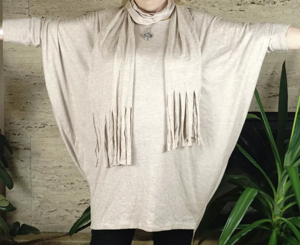 Női nagyméretű denevérujjas tunika sállal, bézs színben.