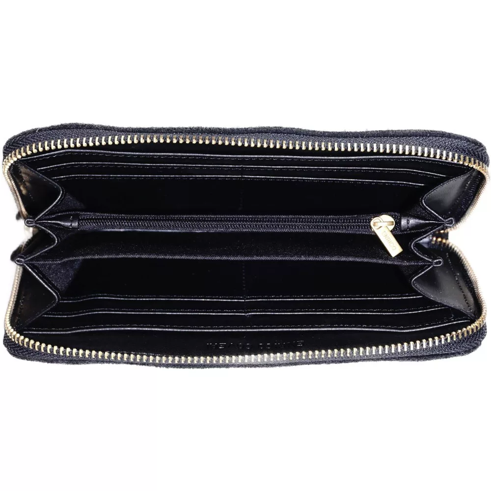 Belül 3 fő széles rekesz, 2 széles benyúlós zseb, 1 cipzáras aprótartó, 8 bankkártyatartó.