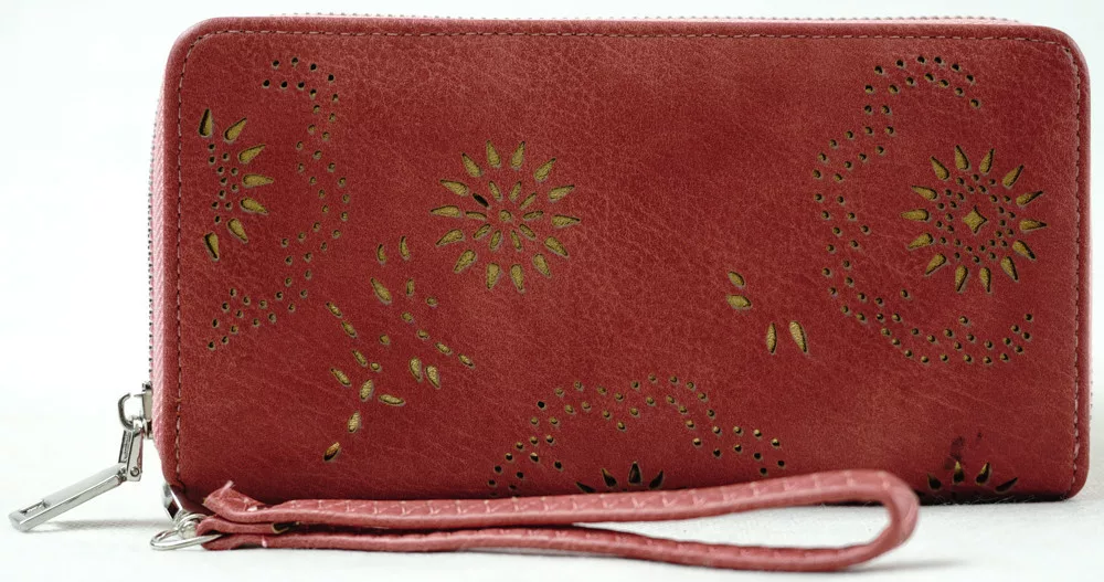 Női pénztárca lézervágott mintával, rózsaszín műbőrből.