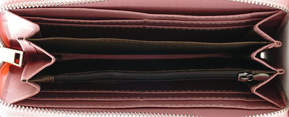 Belül három részre osztott. 8 bankkártyatartója, két széles benyúlós zsebe és egy cipzáras aprótartója van.