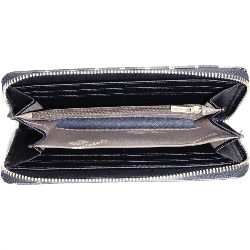 Belül 3 fő széles rekesz, 2 széles benyúlós zseb, 1 cipzáras aprótartó, 8 bankkártyatartó.