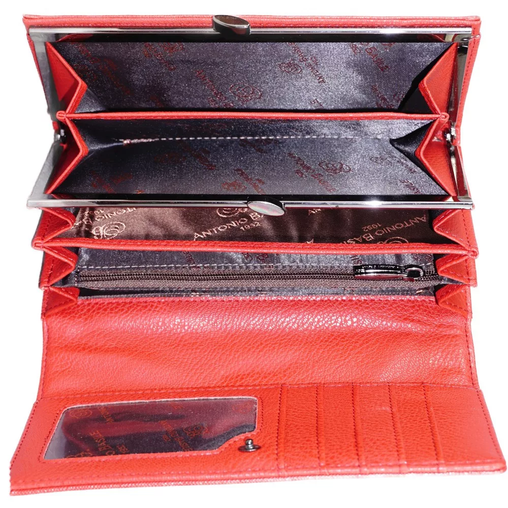 Belül 3 széles rekesz, 1 csatos aprótartó (belül osztott), 1 cipzáras zseb, 1 széles benyúlós zseb és 9 bankkártyatartó.