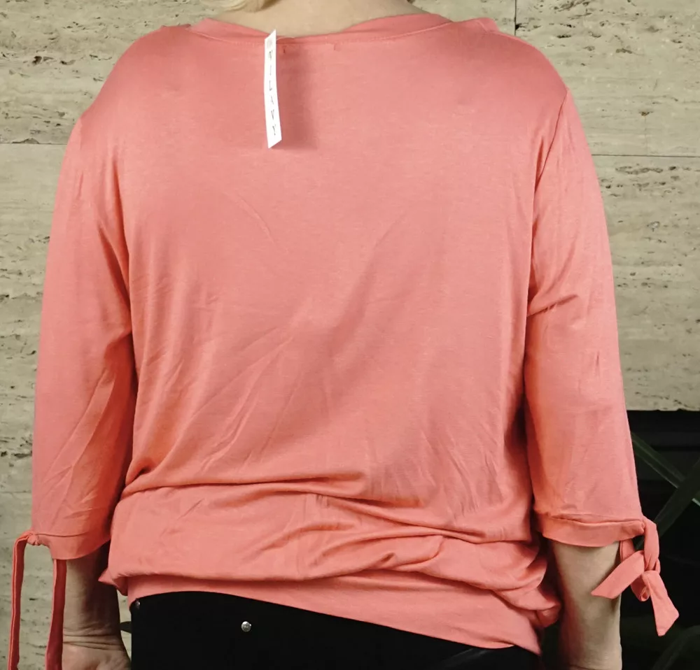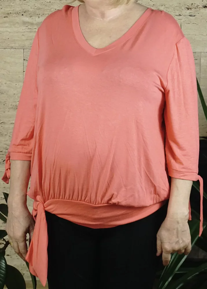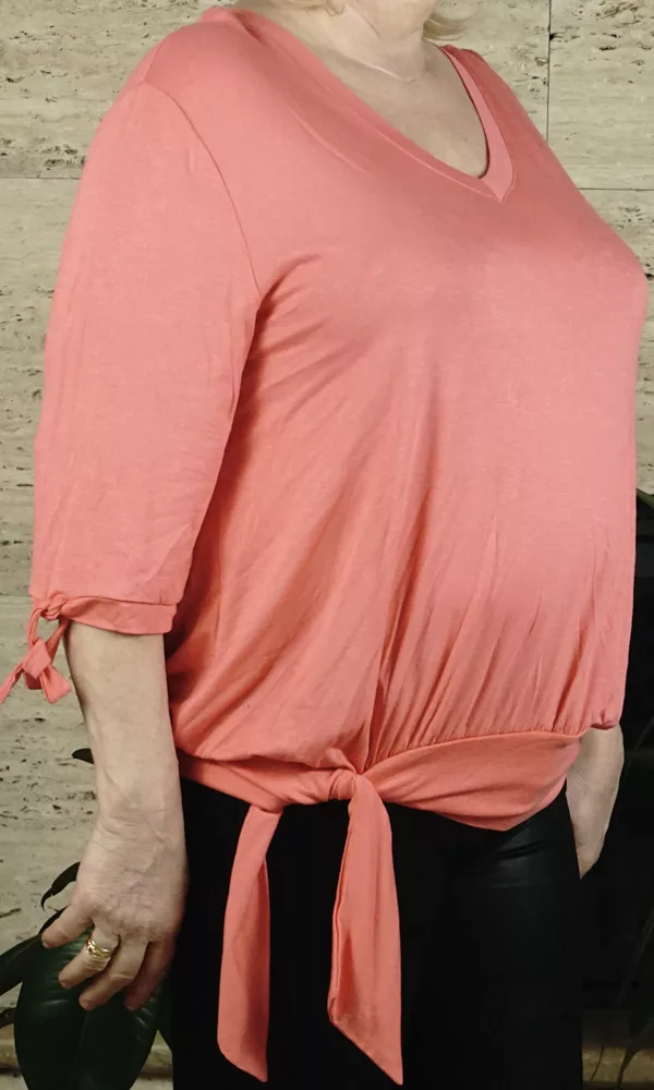 Női póló vállán és derekán megköthető, lazac színben.